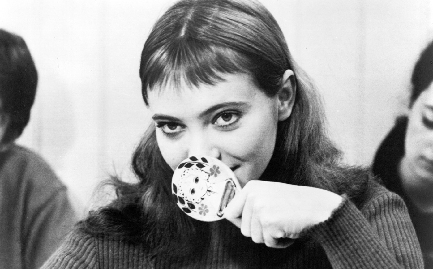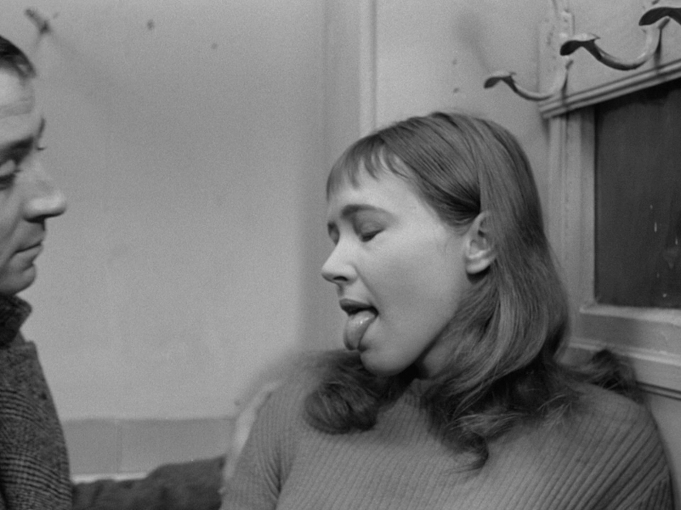 Godard’s “outsiders” are Franz, Arthur, and the beautiful innocent Odile, who all meet in an English Language class. Franz and Arthur are two sides of the same coin: Franz is always thinking, always looking inward and debating, while for Arthur there is only the moment, the black and white of his wants and desires. They dream of the outlaw life: would-be gangsters on the lookout for a big score, mimicking the gunfights of Billy the Kids and wanting to go away to someplace, anyplace more exotic than where they are now. Odile, played by Godard’s wife Anna Karina, is the shy flower, living with her aunt and a lodger, Mr. Stolz. She’s the image of young beauty, trying to prove she’s worldly and knowledgeable even as she betrays her naivete when asked to show that she knows how to kiss: