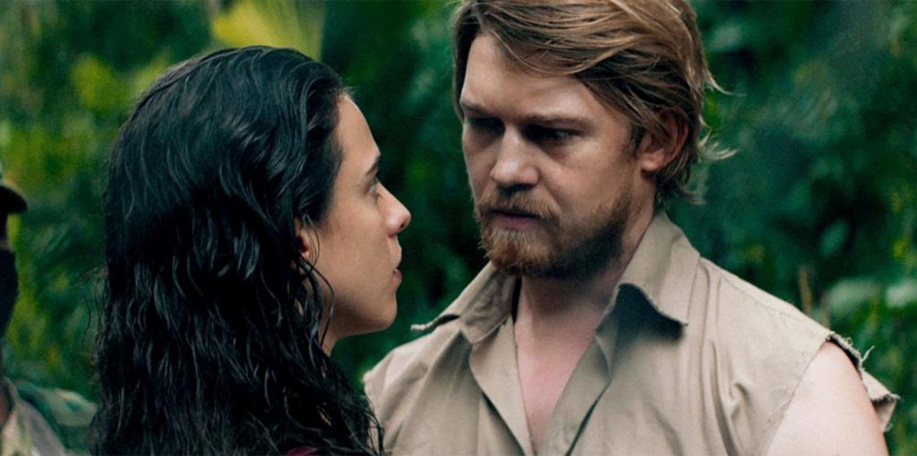 The focus of the film though falls on two people. It’s possible they came to Nicaragua because they wanted to gamble on possibility. Margaret Qualley’s Trish Johnson went as a journalist wanting to cover missing people. When we’re introduced to her, her press card is revoked and she’s sleeping with people to get enough money to leave. From the first scene where Trish tries to avoid her john/protector Subtiente Verga, we know she’s in too deep. Yet her attitude is always externally playful. Her editor, played by John C. Reilly in a very brief role, won’t pay for her to go Costa Rica. He already put money into her. Why is Trish writing about missing people and murders? She’s writes for a luxury hotel magazine. Trish always thinks she’ll plead her way out of whatever situation she’s in with her editor or a vice minister not realizing, maybe not caring, she’s only putting herself in more trouble.