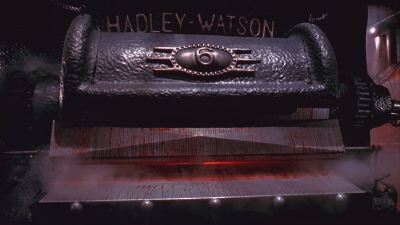 Also because this is a Tobe Hooper movie, there’s a strong streak of social criticism in this movie. As much as it’s movie about a killer laundry press, The Mangler is also a movie about how capitalism chews and spits out the workers. Most of the movie is spent in the warehouse, where it seems like no one ever goes home. Robert Englund’s Bill Gartley lords over his workers. They’re not people but means of production to facilitate his wealth. In fact, he’s a man willing to sacrifice his own family to secure his wealth and power. It’s clear this industrial laundry is the only place of employment in this town. Workers look sweaty and overworked. The first victim of the machine is an elderly woman whose body clearly was destroyed by the years of work in this place. Later a worker has to sever the arm of his foreman after they try to disassemble this killer machine. Much like Tobe Hooper’s films for Cannon Films, there’s a baroque quality to the production design of the film. The industrial laundry looks like a Victorian factory. It’s as if to say that while time has passed outside, maybe the struggles of workers in the twentieth century are still no different than those of the nineteenth century.