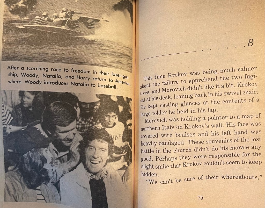 I do not believe the Condorman story has enough going on to merit a serious expansion of the plot and character details. So when author Joe Claro turns Marc Stirdivant’s script into a novel by mostly rewriting script notes into full paragraphs, it is an act of mercy that keeps the proceedings quite short. A character expresses a need to travel to a different country and in the next sentence they have arrived at their destination. If the movie has an action scene that doesn’t really work, it’s summed up in a couple of sentences in the book. You could finish this in a single setting without missing a beat.
